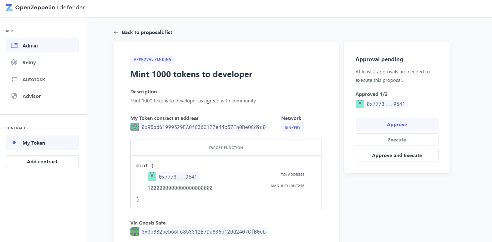 This guide will walk through managing an ERC20 token using Defender Admin and Gnosis Safe, specifically proposing to mint tokens and then approving this proposal.